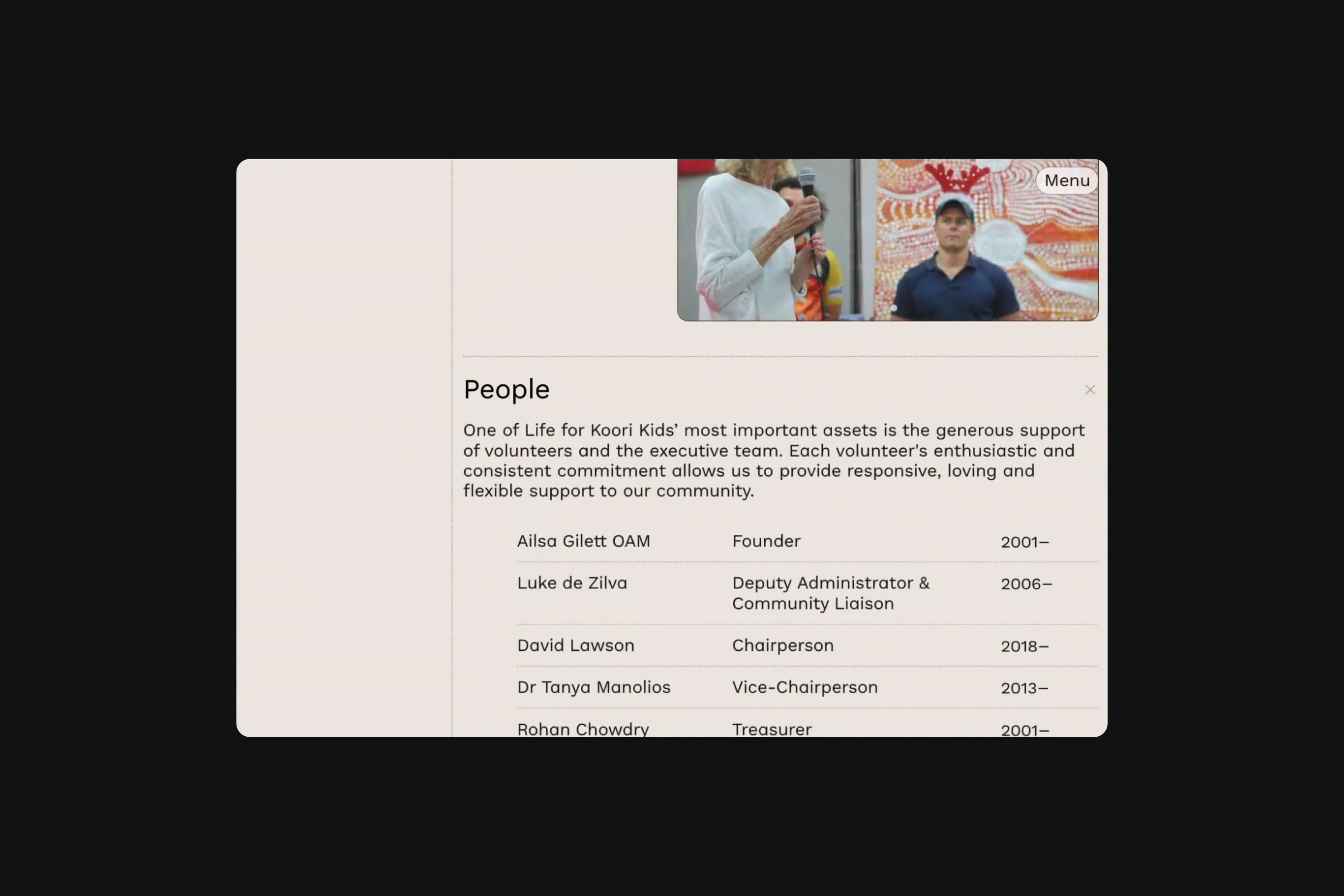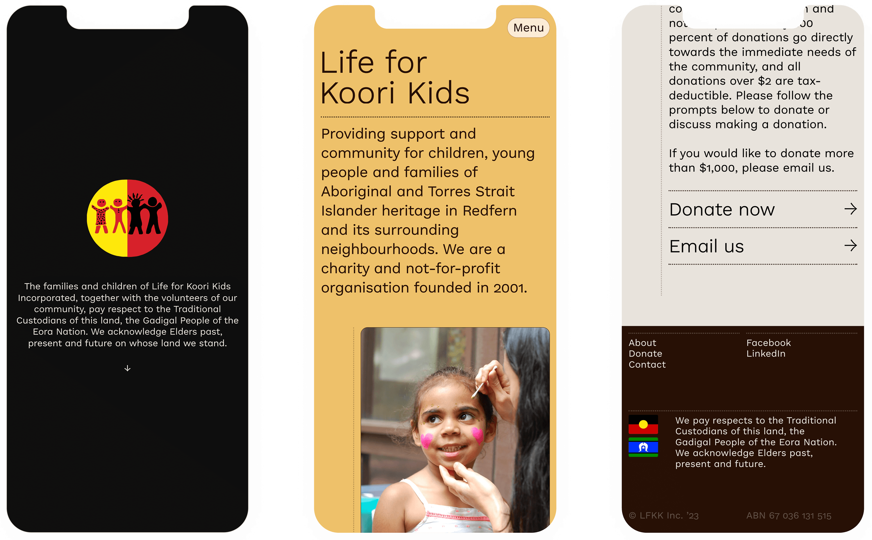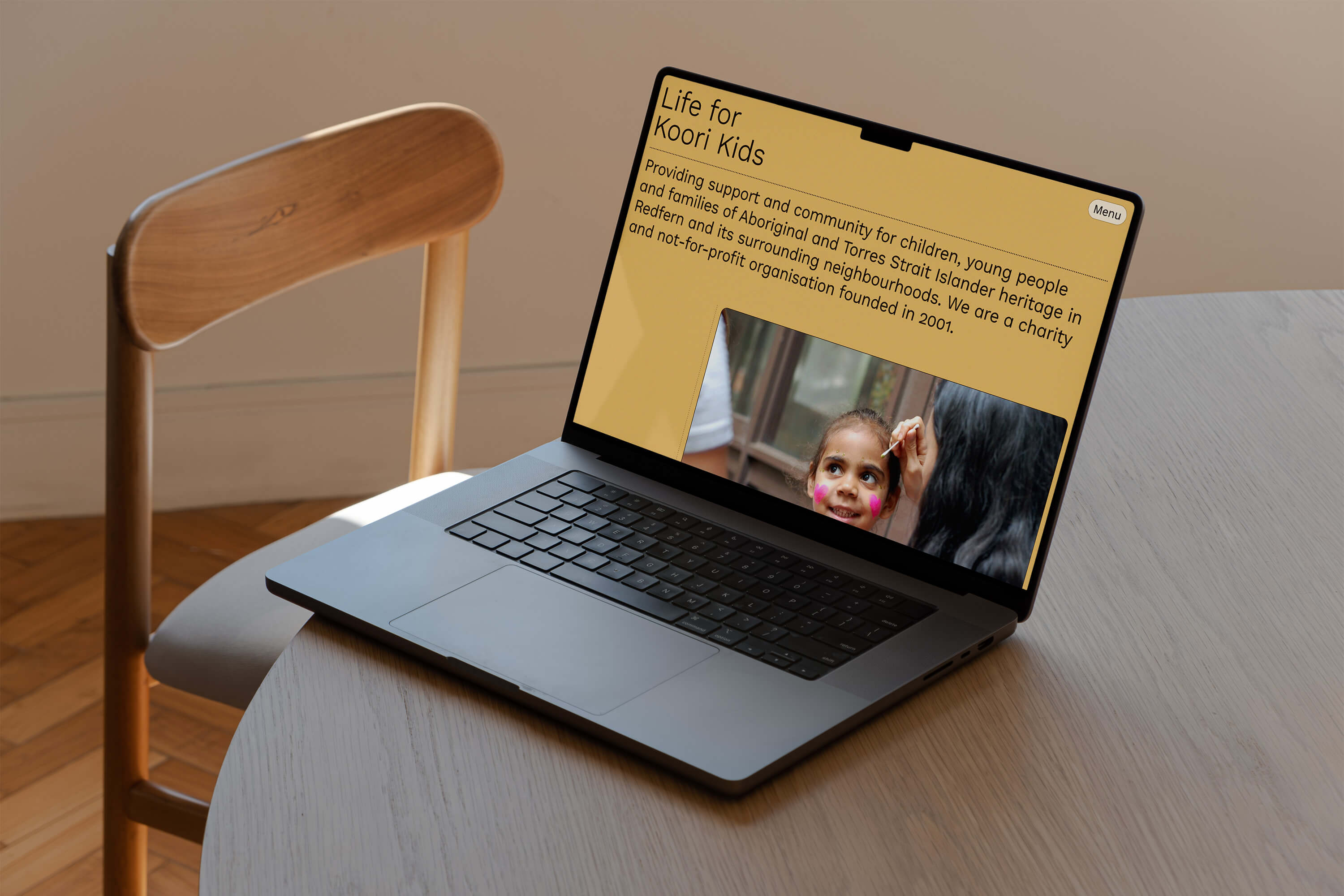 Founded in 2001, Life for Koori Kids is an Eora-based charity and not-for-profit providing support and community for children, young people and families of Aboriginal and Torres Strait Islander heritage. We refreshed their website, featuring an interactive gallery exhibiting a selection of paintings from the kids.