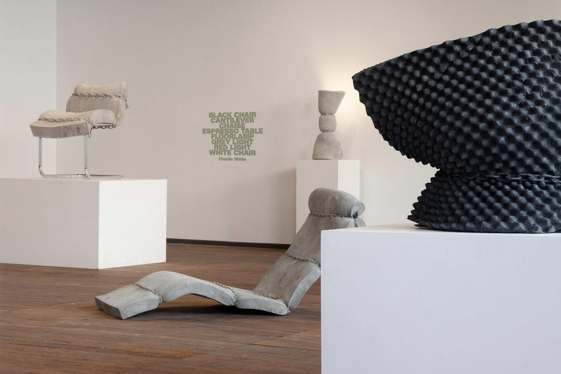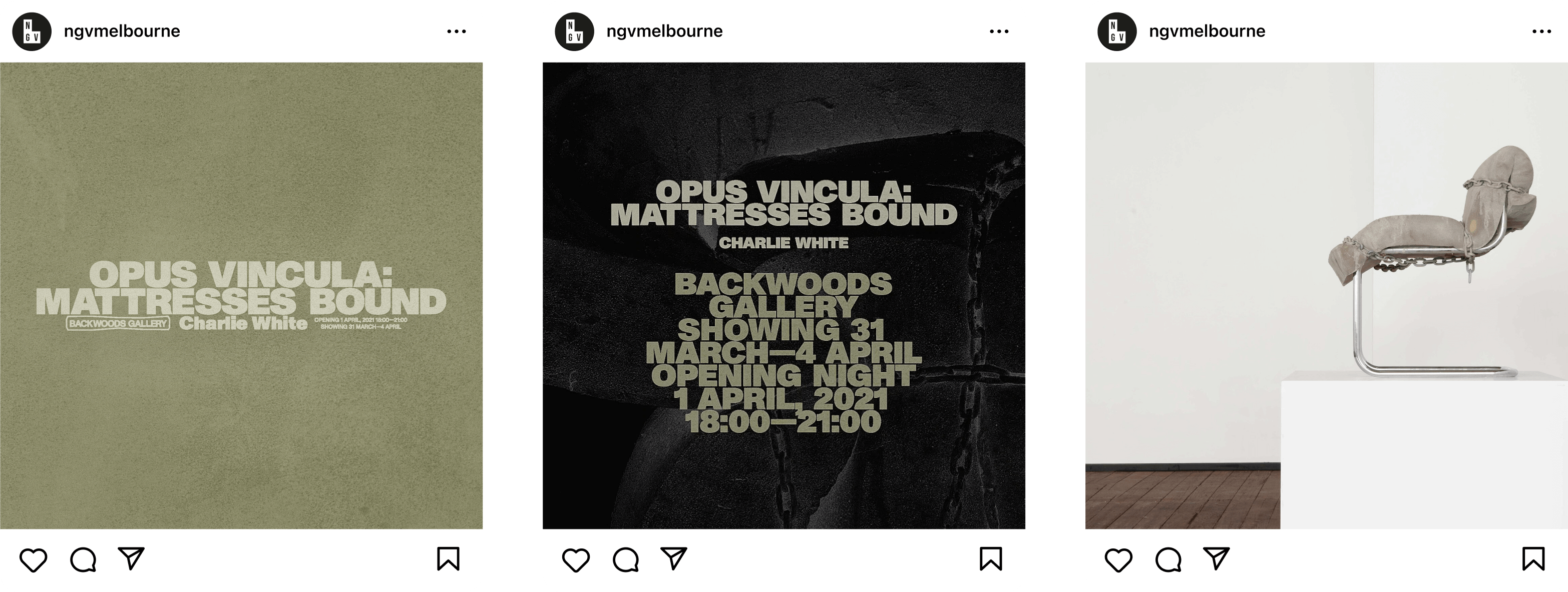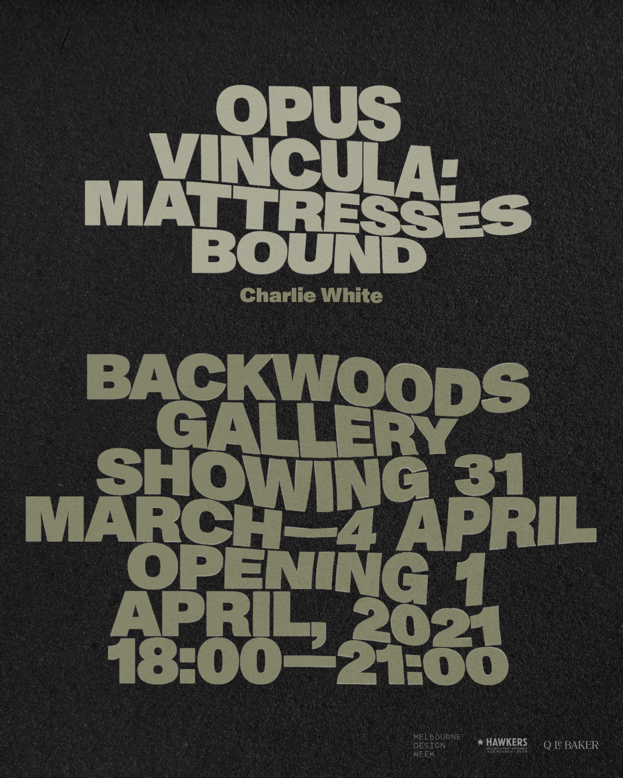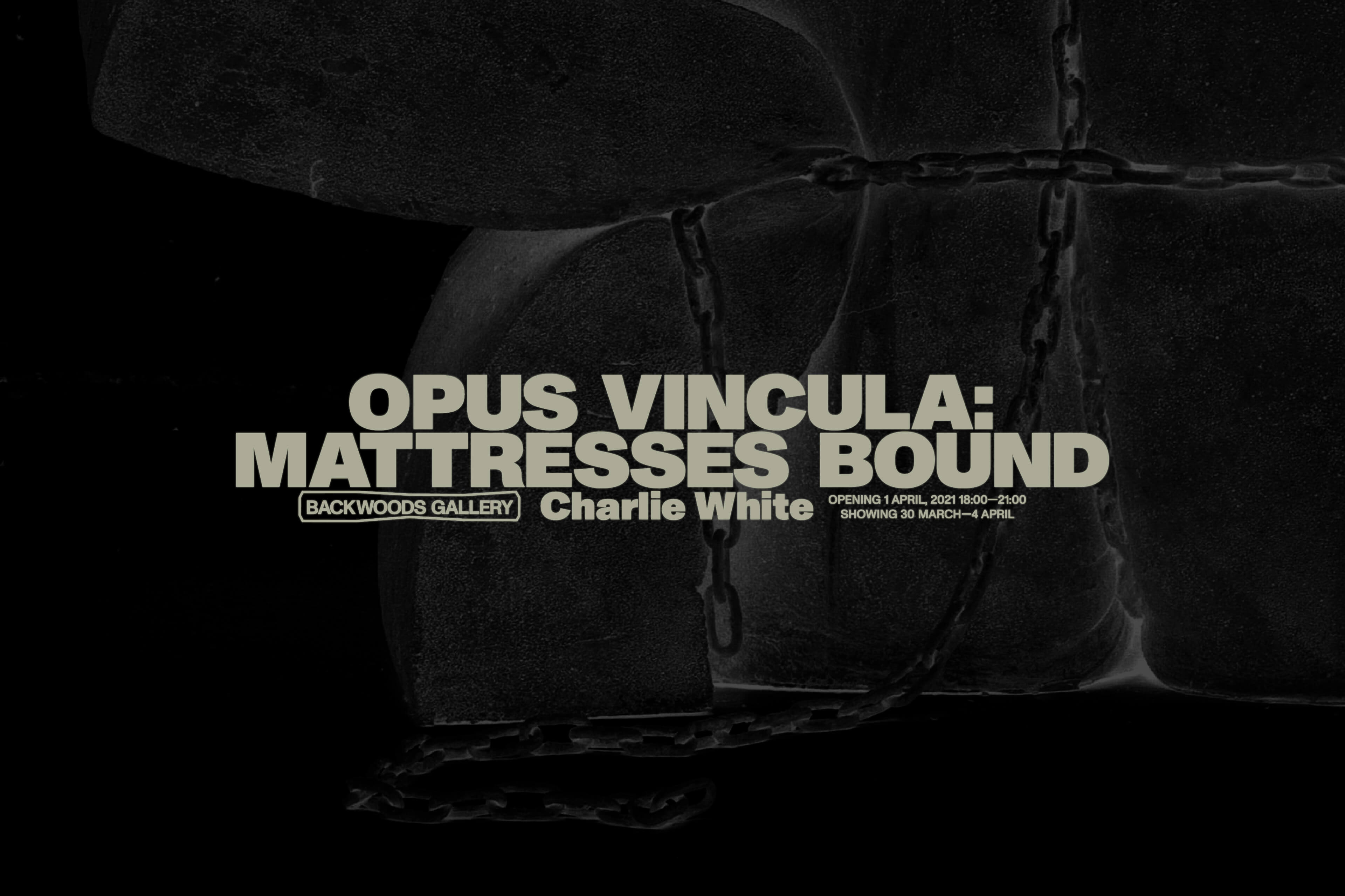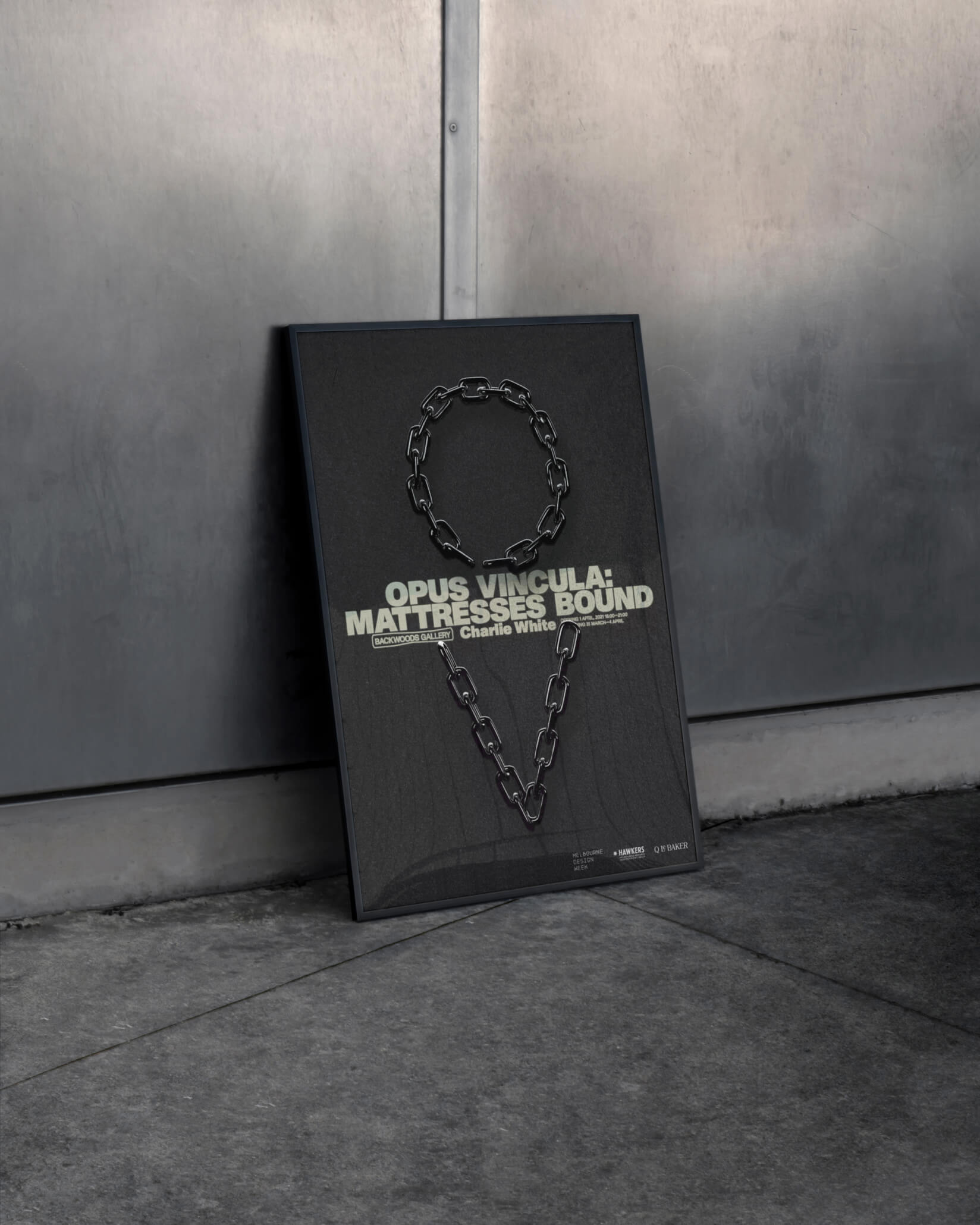 Opus Vincula is the debut solo exhibition of ExLab artist Charlie White, featuring experimental cement forms and chain-bound furniture made from discarded mattress foam found on the streets. The exhibition identity draws inspiration from a range of source material, from heavy metal cover art to brutalist architecture, exploring materiality through heterogeneous combinations of photo-image, typography, and 3D animated forms.