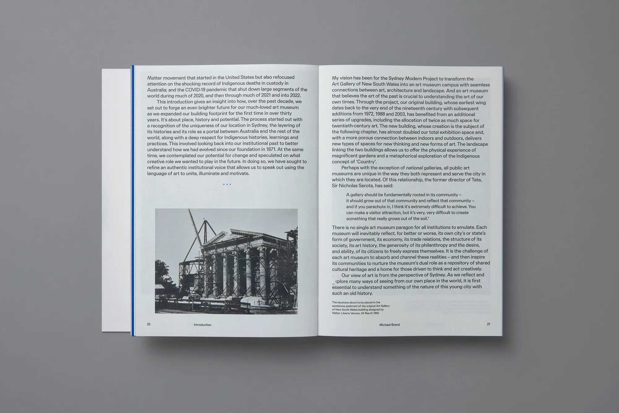 To mark the launch of a once-in-a-generation transformation of the Art Gallery of New South Wales by world-renowned architects, SANAA (Japan), Mucho designed a commemorative publication. The book considers what is unique about presenting art from the perspective of Eora/Sydney and Australia, bringing to their work a consciousness of the past and the future as an open possibility.